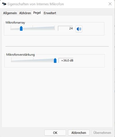 - Wechseln sie auf den Reiter „Pegel“ und stellen die Mikrofonverstärkung auf +36 dB