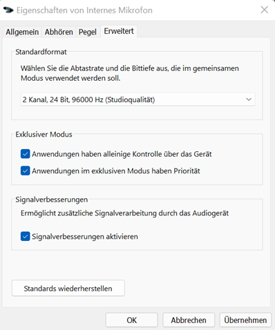 - Wechseln sie auf den Reiter „Erweitert“ und stellen Sie das Standardformat auf „2 Kanal, 24 Bit, 96000 Hz (Studioqualität)“